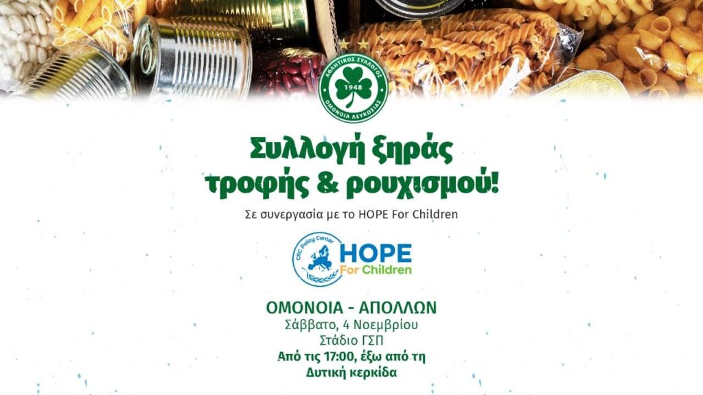 Απλώνουμε χέρι βοηθείας στον Ανεξάρτητο, Διεθνή Ανθρωπιστικό Οργανισμό, HOPE For Children και σε συνεργασία μαζί του θα συλλέξουμε ξηρά τροφή και ρουχισμό στον αποψινό εντός έδρας αγώνα μας με τον Απόλλωνα Λεμεσού.